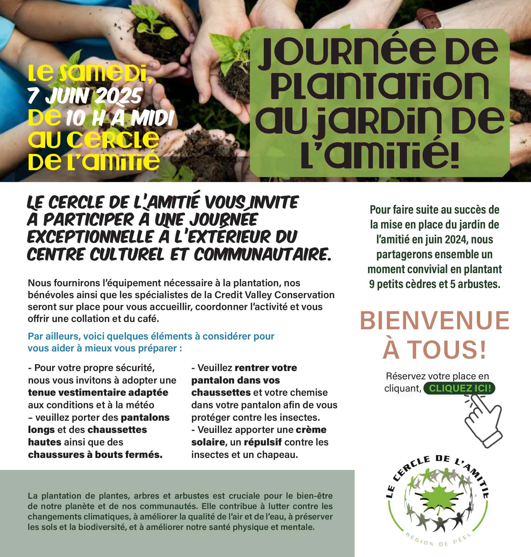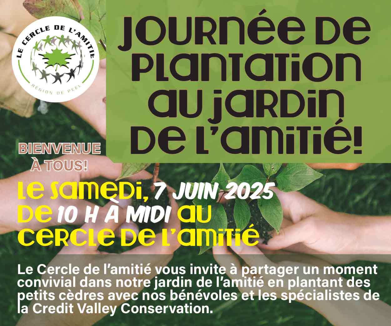 Le Cercle de l’Amitié vous invite à partager un moment convivial dans notre jardin de l’amitié en plantant des petits cèdres avec nos bénévoles et spécialistes de Credit Valley Conservation. Réservez en communiquant par courriel à coordination@cercleamitie.ca ou par téléphone au 905-542-1844.